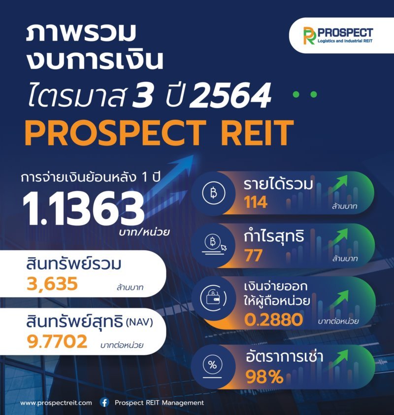 นางสาวอรอนงค์ ชัยธง ประธานเจ้าหน้าที่บริหาร บริษัท พรอสเพค รีท แมเนจเม้นท์ จำกัด ในฐานะผู้จัดการกองทรัสต์ ทรัสต์เพื่อการลงทุนในสิทธิการเช่าอสังหาริมทรัพย์พรอสเพค โลจิสติกส์และอินดัสเทรียล หรือ PROSPECT REIT เผยผลการดำเนินงานไตรมาส 3 ปี 2564 (สิ้นสุด ณ วันที่ 30 กันยายน 2564) มีรายได้รวมทั้งสิ้นจำนวน 114.11 ล้านบาท เติบโตเพิ่มขึ้น 3.3 ล้านบาท หรือ 3% ปัจจัยบวกจากอัตราการเช่าพื้นที่ที่สูงถึง 98% อีกทั้งการบริหารจัดการที่ดี ทำให้ค่าใช้จ่ายลดลง 1.94% จึงเป็นผลให้มีกำไรสุทธิเพิ่มขึ้นจากไตรมาสก่อน 5.53 % ทั้งนี้ตลอดระยะเวลา 9 เดือน สามารถสร้างรายได้รวมจำนวน 332.85 ล้านบาท พร้อมประกาศจ่ายผลประโยชน์ตอบแทนแก่ผู้ถือหน่วยประจำไตรมาสนี้ในอัตรา 0.2880 บาทต่อหน่วย ซึ่งมีกำหนดจ่ายในวันที่ 9 ธันวาคม 2564 ทั้งนี้ในรอบ 1 ปีของการจัดตั้ง PROSPECT REIT ได้ประกาศจ่ายเงินออกให้ผู้ถือหน่วยไปแล้วย้อนหลัง 1 ปี รวมอยู่ที่ 1.1363 บาทต่อหน่วย นับว่าผลตอบแทนปีแรกเติบโตได้สูงกว่าที่ประมาณการไว้ในหนังสือชี้ชวน
